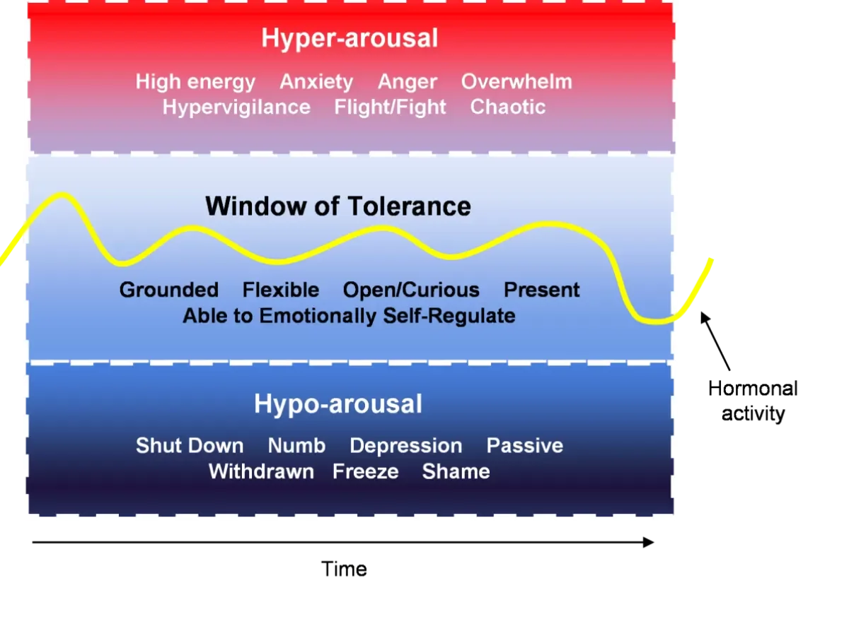 When someone is within this window, emotions can move through the body like waves, rising and falling naturally without becoming too intense to handle. However, when intensity exceeds this capacity, the nervous system shifts into survival states. This can show up as hyperarousal (anxiety, panic, overwhelm) or hypoarousal (numbness, shutdown, dissociation), both of which make it difficult to stay connected to the present moment or continue the healing process.